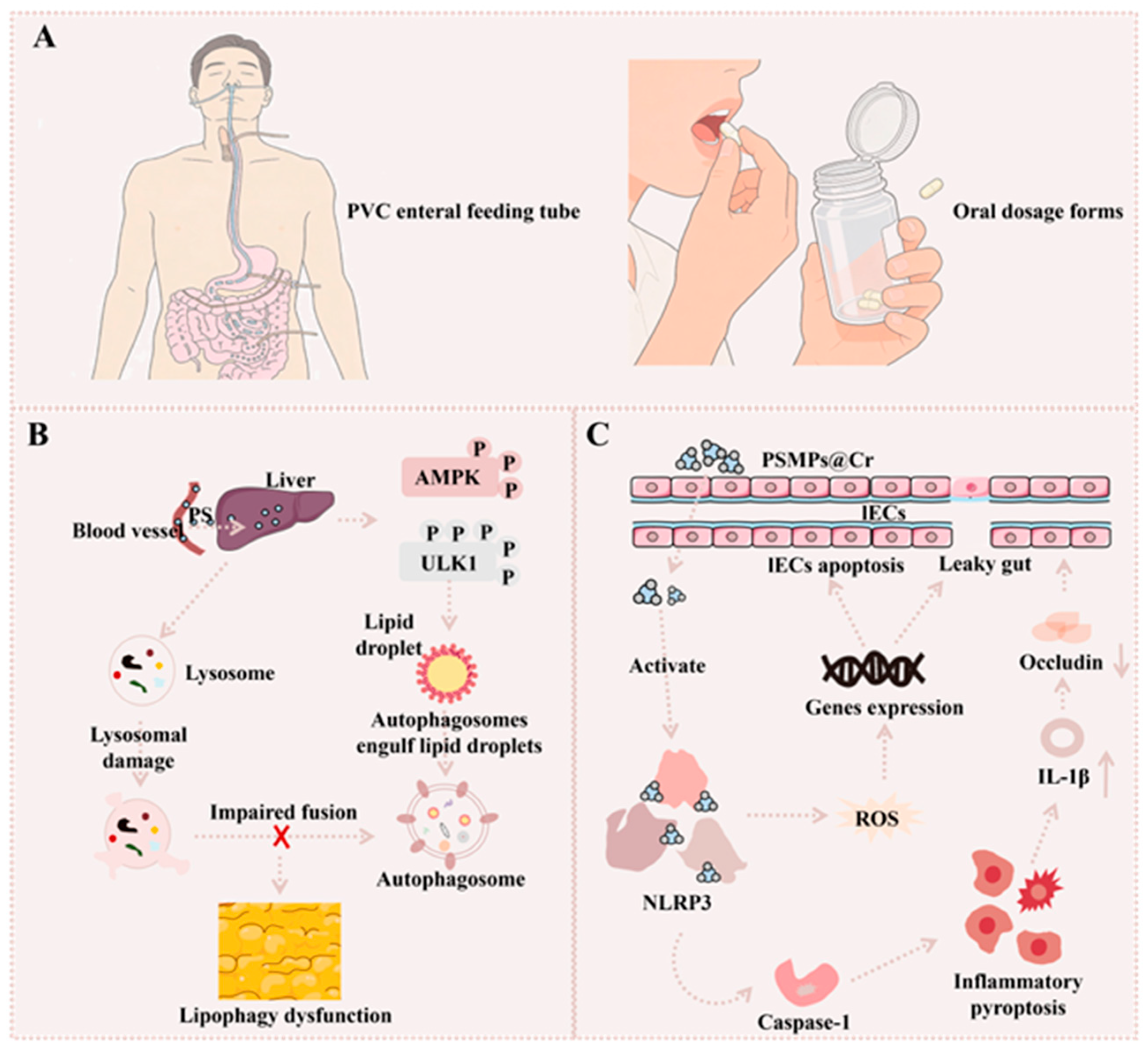 | Digestive | Feeding tubes, Drug packs | Lipid accumulation, Barrier disruption | AMPK/ULK1, NLRP3 | In vitro, Animal, Limited | Chronic low-dose risk | [78,80] |