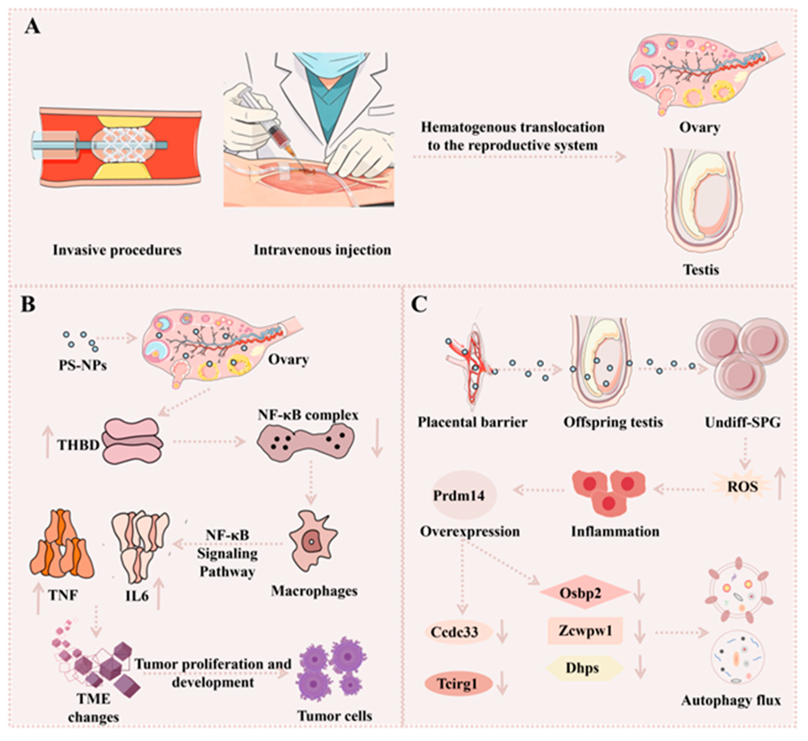 | Reproductive | IV, Invasive, Placental | Dysfunction, Impaired sperm | Estrogen interference, Prdm14 | Animal, Limited clinical | Synergistic toxicity | [90,94] |