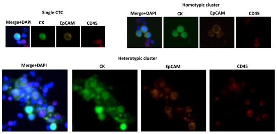 Examples of single CTC and homotypic and heterotypic CTC clusters. Staining: tumor markers (pan-cytokeratin—CK, EpCAM), WBC (CD45), nuclei (DAPI). Luminal breast cancer, image generated using CytoTrack system (M. Szostakowska-Rodzos).