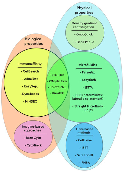 Methods commonly used in CTC isolation. Methods classified according to biological and physical properties, with some using mixed techniques, to improve specificity (overlapping ellipses).