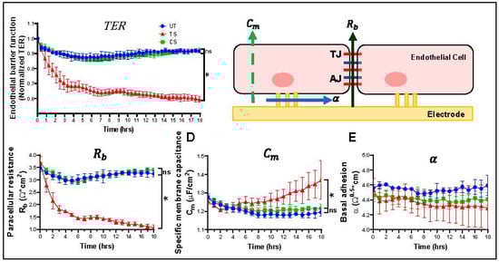 IL-6 trans-signaling, but not classical signaling, disrupts endothelial barrier function in human retinal endothelial cells (HRECs). Electric cell impedance sensing (ECIS) apparatus was used to measure changes in barrier function. (A) IL-6 trans-signaling (TS) significantly disrupted trans-endothelial resistance (TER) in HRECs relative to untreated (UT), whereas there was no significant effect of IL-6 classical signaling (CS); (B) schematic representation of the impedance parameters for barrier integrity as measured by ECIS: paracellular resistance (Rb), indicative of the distance of intercellular junctions; cell membrane capacitance (Cm), a measure of cell membrane integrity, and basal adhesion (α), detailing subcellular attraction to the substrate; (C) IL-6 trans-signaling caused a drastic reduction in paracellular resistance (Rb) of intercellular junctions, and (D) a significant increase in cell membrane capacitance (Cm); (E) no change in basal adhesion (α) occurred. IL-6 classical signaling had no effect on all these parameters. Results are expressed as means ± SD; n = 3–5 biological replicates per group, * p-value < 0.05 vs. untreated (TS vs. UT); ns = not significant.