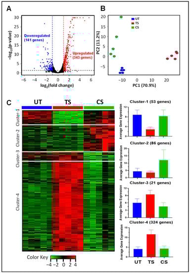 For RNA-Seq data, read counts were normalized based on median of ratios. DESeq2 R package was used for differential expression analyses using negative binomial regression model [39,40]. Genes with a false discovery rate (FDR) < 0.05 were considered differentially expressed. Principal component analysis (PCA) was performed using “prcomp” function in R to investigate overall differences in gene expression profiles between treatment groups. Further, the differentially expressed genes were clustered into four groups using unsupervised hierarchical clustering. Expression patterns of these genes were visualized through heatmap using gplots package in R [41]. Gene ontology (GO) analyses were performed to associate the differentially expressed genes with biological processes, cellular components, and molecular functions. The GOFIG software package (https://github.com/adidevara/GOFIG, accessed on 29 July 2021) was used to perform gene ontology enrichment analysis and visualization [42]. All of these statistical analyses were performed using R version 4.0.3 [39].