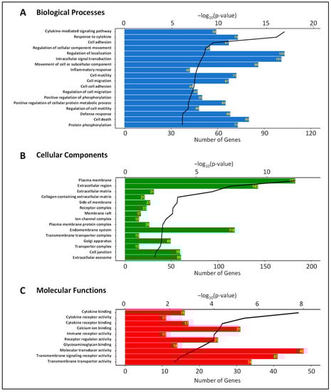 Biological processes (A); cellular components (B), and molecular functions (C) associated with differentially expressed genes in HRECs after activation of IL-6 classical and trans-signaling. Bioinformatics analysis was performed to determine significantly enriched Gene Ontology (GO) terms. The horizontal bars represent the number of genes annotated to each GO term and the black lines represent the p-value of enrichment.