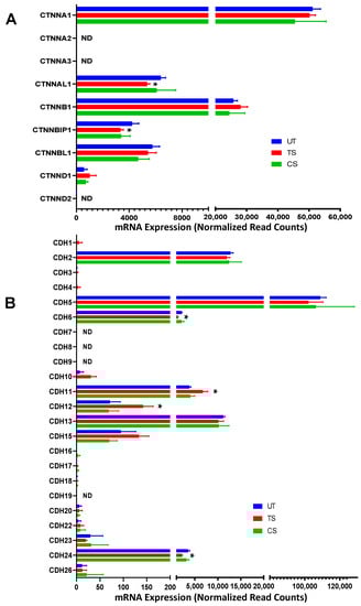 Differential expression of genes encoding adherens junctions following IL-6 classical and trans-signaling activation in human retinal endothelial cells (HRECs). Relative mRNA expression levels of 9 catenin-related genes (A) and 23 cadherin-related genes (B). Results are expressed as means ± SD; n = 5 per group. UT: Untreated group (blue), CS: IL-6 classical signaling group (green), TS: IL-6 trans-signaling group (red). * p-value < 0.05 vs. untreated (TS vs. UT); ND = not detected.