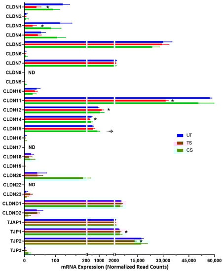 The effects of IL-6 classical and trans-signaling on the genes involved in encoding tight junction proteins in human retinal endothelial cells (HRECs). The relative mRNA expression from RNA-Seq identified 27 genes that form or regulate tight junctions. Results are expressed as means ± SD; n = 5 per group, * p-value < 0.05 vs. untreated (TS vs. UT); † p-value < 0.05 vs. untreated (CS vs. UT); ND = not detected.