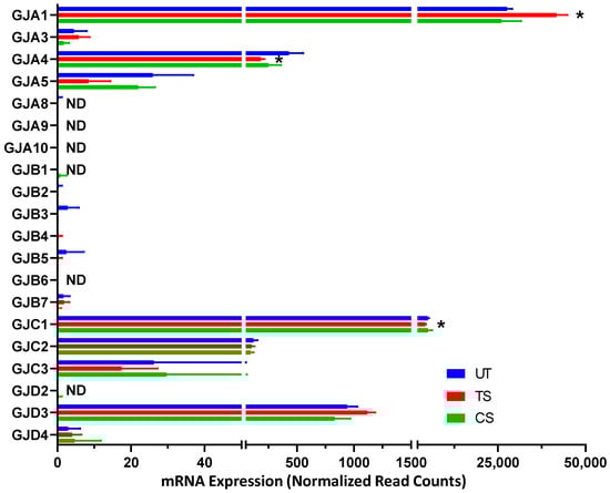Differentially expressed genes encoding gap junctions following activation of IL-6 classical and trans-signaling in human retinal endothelial cells (HRECs). RNA-Seq analysis detected 20 gap junction-related genes and revealed significant changes in 3 genes due to IL-6 trans-signaling (TS) activation compared to untreated (UT). Results are expressed as means ± SD; n = 5 per group, * p-value < 0.05 vs. untreated (TS vs. UT); ND = not detected.