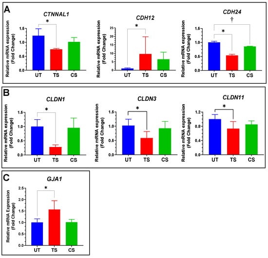 Confirmation of differentially expressed genes in inter-endothelial junctions of HRECs by qRT-PCR analysis. (A) Relative expression for three adherens junctions, including CDH12, CDH24, and CTNNAL1; (B) CLDN1, CLDN3, and CLDN11 genes were significantly downregulated in IL-6 trans-signaling group, with no significant effect observed from classical signaling; (C) GJA1 mRNA levels were measured, and RT-PCR confirmed its upregulation after IL-6 trans-signaling activation with no effect due to classical signaling. Results are expressed as means ± SD; n = 3–16, * p-value < 0.05 vs. untreated (TS vs. UT); † p-value < 0.05 vs. untreated (CS vs. UT).
