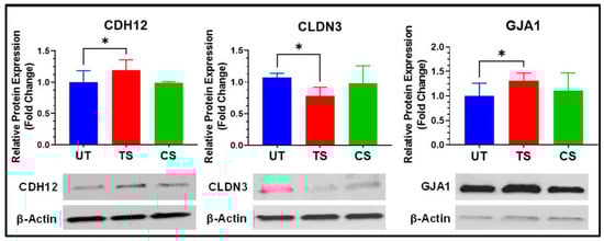 Protein levels were assessed using Western blotting for three proteins (cadherin 12, CDH12; claudin 3, CLDN3; and gap junction protein alpha 1, GJA1) to represent the adherens, tight, and gap junctions, respectively (Figure 8). Activation of IL-6 trans-signaling showed significant upregulation of CDH12 (1.19-fold) and GJA1 (1.32-fold) relative to untreated HRECs. CLDN3 expression was significantly downregulated (0.73-fold) in response to IL-6 trans-signaling alone. Activation of IL-6 classical signaling showed no significant effect on the expression of these proteins in HRECs. These trends for CDH12, CLDN3, and GJA1 were observed across RNA-Seq, qRT-PCR, and Western blot analyses, showing transcriptional and translational changes to adherens, tight, and gap junctions in response to IL-6 trans-signaling in HRECs.