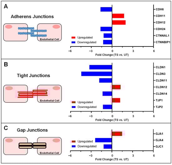 Gap junctions consist of connexins that participate in intercellular transport and promote the formation of tight junctions and adherens junctions [1,53,54,55]. These junctional molecules are transient between cells, lasting only a few hours, allowing rapid cellular response to the extracellular environment [56]. Previous studies suggest that IL-6 signaling has significant effects on gap junction formation [57,58]. In this study, IL-6 trans-signaling caused significant downregulation of GJA4 and GJC1 and upregulation of GJA1, while classical signaling exhibited no significant effect on expression of gap junction genes.
