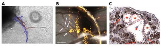 The optical transparency of the zebrafish embryo makes it an excellent in vivo model to study tumor progression, tumor angiogenesis, and tumor metastasis, allowing high-resolution live imaging [92]. Briefly, labeled cancer cells are injected into the yolk of the zebrafish embryo two days post-fertilization. The migration of cancer cells outside the bloodstream can be followed in live time-lapse imaging for 2 to 3 days post-injection. Of course, the zebrafish embryo is a suitable model to evaluate the classic intravascular metastasization and the EVMM simultaneously. Alternatively, EVMM can be analyzed in the chick embryo chorioallantoic membrane model (CAM). The CAM is a highly vascularized membrane that wraps the embryo and transports oxygen, calcium, and metabolites. In this context, tumor cells can be seeded on the CAM and followed over time in ovo [27]. The migration of cancer cells and their association with blood vessels can be monitored by using a stereomicroscope over 72 h (Figure 2B). Moreover, the samples can be fixed and analyzed by histology to visualize the angio-complex (Figure 2C). Specific approaches have been developed to study the angiotropic and EVMM processes. For this purpose, GFP-tagged human metastatic melanoma cells were stereotactically injected into the brain, and a vascular tracer was administered in the jugular vein of immunodeficient mice allowing the visualization of the interaction of melanoma cells with the brain vasculature [93]. The constant development of optically transparent chambers for live-imaging techniques may lead to new studies and new knowledge in the field of EVMM [94].