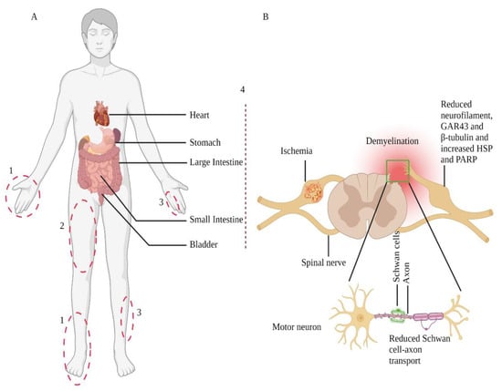 The changes in neuronal cell bodies also affect axons, especially distal terminals. Chronic diabetes changes sensory neurons phenotype at the dorsal root ganglia, which links their relationship with the distal axon branches. A rat model of chronic T1DM showed a gradual loss of neurofilaments synthesis and export []. These neurofilaments are structural scaffolds of the axon. Another preclinical study in diabetic animals proposed endoplasmic reticulum stress in diabetes could potentiate peripheral nerve damage and affect functioning []. Although the exact mechanism of the disease pathogenesis is not clear yet, several in vitro and in vivo models of diabetes have shown hyperglycemia could alter several critical functions in plasticity, including growth-associated protein 43 (GAP43), Heat Shock Protein (HSPs) expression [,], and poly(ADP-ribose) polymerase (PARP) [,] at the dorsal root ganglia region (Figure 1). These data indicate that dysfunction in these pathways promotes abnormal protein processing, inducing oxidative damage and mitochondrial dysfunction, which, in turn, may damage peripheral nerves [].