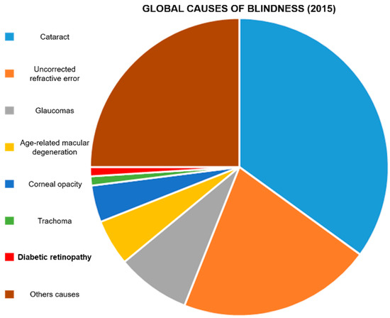 Diabetes mellitus is a group of diseases characterized by chronic hyperglycemia, and the most common expressions of this condition are type 1, type 2, and gestational diabetes [1]. While type 1 diabetes is an autoimmune disease causing an abnormal immune response against insulin-producing β-cells, significantly blunting the expression of this hormone [2], type 2 [3] and gestational diabetes [4] are also characterized by a certain level of skeletal muscle, liver, and adipose tissue insulin resistance. Genetic, environmental, and behavioral factors, as well as maternal obesity, can cause these conditions. Diabetes incidence is increasing worldwide [5]: the population affected by this disease triplicated in the last 40 years [6], and it keeps on growing [7]. Diabetes-associated conditions affect multiple organs and organ systems, resulting in polyneuropathy [8], angiopathy [9], infections [10], nephropathy [10], dementia [11], cardiovascular complications [12], lower limb amputation [13], and blindness [14]. These phenomena are often irreversible and accompanied by a structural and functional impairment of the tissue microcirculation [15]. Vascular degeneration is particularly prominent in the eye, leading to diabetic retinopathy (DR) [16]. DR affects patients aged between 20 and 65 [17], and its symptoms appear about ten years after diabetes onset [18]. It has been estimated that 20–30 million patients are at risk of irreversible vision loss because of DR [19,20], which is currently one of the leading causes of visual impairment (Figure 1) [21,22,23] and the leading cause of blindness in preventable retinal diseases [24].