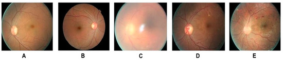 Different stages of DR: (A) Healthy retina (B) mild NPDR (detectable presence of micro aneurysms) (C) moderate NPDR (significant presence of micro aneurysms) (D) severe NPDR (Intraretinal microvascular abnormalities) (E) PDR (presence of hemorrhages). Adapted from Shankar et al. [22].