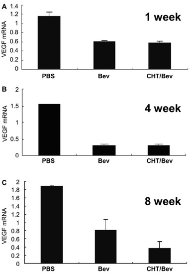 Effects of bevacizumab-loaded chitosan nanoparticle on the mRNA expression of VEGF in an in vivo model of DR: VEGF m-RNA expression were evaluated 1 (A), 4 (B) and 8 (C) weeks after intravitreal injection with PBS, non-encapsulated bevacizumab (Bev) and bevacizumab encapsulated in chitosan nanoparticles (CHT/Bev). Reprinted from Lu et al. [55].