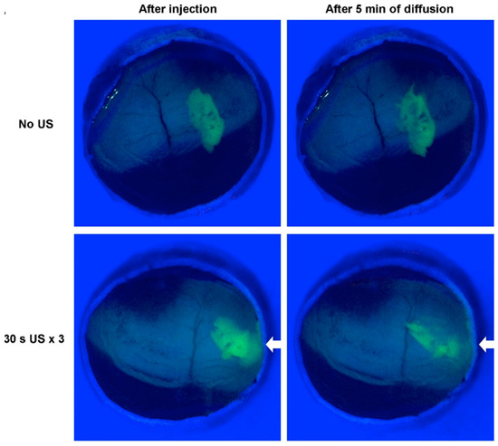 Interestingly, particle retention for both groups was only observed in the disease model and not in healthy mice, confirming that retinopathy can represent a targetable condition via HA. Similarly, Ji Hoon et al. coated albumin nanoparticles with PEG instead of HA, to increase their hydrophilicity and biocompatibility [91]. This system loaded with apatinib showed an anti-VEGF action in vitro via transepithelial electric resistance measurement. In vivo, intravitreally injected loaded particles inhibited edema generation in a model of DR. The group of Dr. Rupenthal tested the permeation of albumin nanoparticles in the vitreous humor under ultrasound pulse [92] (Figure 5). This effect was due to thermal and physical effects (e.g., cavitation, acoustic, streaming, and mechanical stress). The particles were loaded with an anti-angiogenic peptide derived from Connexin43. The transscleral and, above all, the intravitreal application of ultrasounds significantly enhanced the ex vivo diffusion of the particles in the vitreous humor of bovine eyes, allowing efficient interactions with the deepest layers of the retina. However, the scientists concluded that the transscleral application provided higher benefits, since it was significantly safer and less invasive.