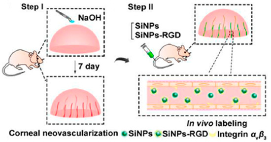 Binding ability of SiNPs/SiNPs-RGD to angiogenic blood vessels in the cornea of mice. Schematic diagram of the experimental procedure. Reprinted with permission from [68] Copyright 2018 American Chemical Society.