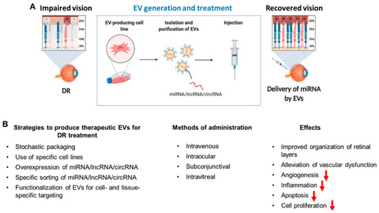 Application of EVs for treating DR. (A) Pipeline for using EVs for DR treatment. EVs are produced in appro-priate cell lines, isolated, and purified using high-throughput methods. EVs are standardized for their payload (thera-peutic miRNA/lncRNA/circRNA) and used for treating DR. (B) Strategies for using EVs in DR and their major therapeutic benefits. Red arrows indicate decrease of the phenomenon.