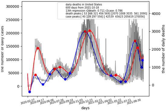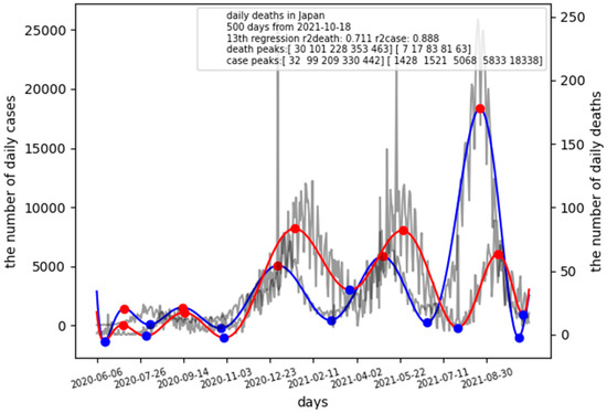 This is for calculating the case fatality rate (CFR) and the lag time in Japan using 500 days from 18 October 2021 with 13th degree polynomial regression curve-fitting. The single graph should pop up on the screen as shown in Figure 1. Figure 1 shows the number of daily cases (infected) and the number of daily deaths by dimmed black colored lines. The graph has the number of daily cases on the left Y-axis and the number of daily deaths on the right Y-axis. The horizontal axis is 500 days from 18 October 2021. A blue-colored line indicates daily cases while red line indicates daily deaths. Red points show maxima, blue points for minima. The legend contains the values for calculating the CFR and the lag time from infection to death using maxima.