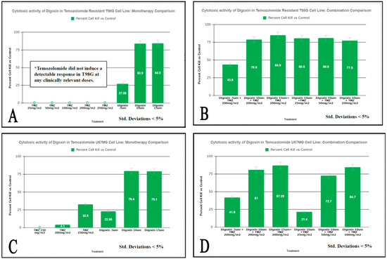 Measurement of cell viability following TMZ and Digoxin Monotherapies and Combination therapies on T98G Cells (panels (A,B)) and U87MG (panels (C,D)) assessed by MTT Assay. T98G and U87MG cells were exposed to a one-hour pulse to the combinations of drugs listed above followed by a 24-h incubation period. MTT was added and cell viability was measured as described in “Materials and methods. Results are expressed as % of the control (95% kill ETOH). Values are the average of 8 replicates at p < 0.05.