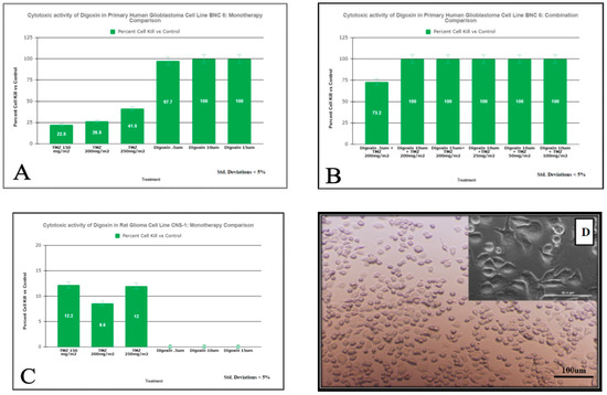 Measurement of cell viability following TMZ and Digoxin Monotherapies and Combination therapies on BNC6 (Panels (A,B)) and CNS-1 cells (Panel (C)) assessed by MTT Assay. Cells were exposed to a one-hour pulse to the combinations of drugs listed above followed by a 24-h incubation period. MTT was added and cell viability was measured as described in “Materials and methods. Results are expressed as % of the control (98% kill ETOH). Values are the average of 8 replicates at p < 0.05. Panel (D) displays monolayer cell culture of primary BNC-6 cells with lowest dose TMZ monotherapy.