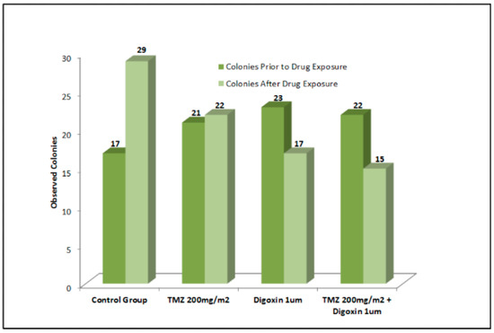 For this experiment, we have used 1:100 dilutions of the Cmax dose tested earlier in the MTT assay to simulate the residual dosage of chemotherapy following clearance from a patient’s system 72 h after infusion. Cells were grown in soft agar in the presence of different drug combinations. After 1 week of growth, colonies were imaged using an inverted light microscope to yield the baseline control pre-treatment images. We found that 1 μM Digoxin inhibited colony formation of T98G cells by 25.41% (Figure 3).
