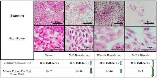 Immunohistochemistry (H&E) staining of treated monolayer slides of T98G cells demonstrated no observable changes in cellularity or colony size in either the TMZ monotherapy or the Digoxin monotherapy treatment groups relative to the control group; however, a marked decrease in cellularity was observed in the TMZ/Digoxin combination group (Figure 4).