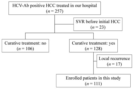In total, 257 HCV-positive patients with HCC were treated at our hospital between May 2006 and December 2020. Among them, 23 patients who had achieved sustained virological response (SVR) before being diagnosed with the initial HCC, 106 patients who had not received curative treatment, and 17 patients who had local recurrence after curative treatment were excluded. Local recurrence was caused by inadequate treatment and was not regarded as “curative” because cancer cells must have survived despite treatment for the initial HCC. Thus, we believe that cases of local recurrence should be excluded from this study. The remaining 111 patients were enrolled in this study. The patient selection flow chart is shown in Figure 1.