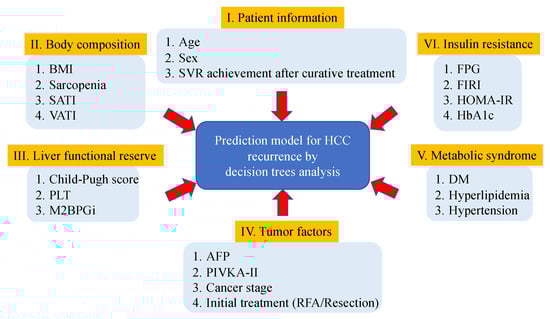 The risk factors affecting HCC recurrence in HCV-positive patients who had received curative treatment for initial HCC were evaluated using decision tree analysis [17]. In this analysis, the recurrence-free survival data was the objective variable, and the following variables were the explanatory variables: I. Patient information, including age, sex, and SVR achievement after curative treatment. II. Body composition, including body mass index (BMI), presence of sarcopenia, subcutaneous adipose tissue index (SATI), and visceral adipose tissue index (VATI). III. Liver functional reserve, including the Child–Pugh score (CPS), platelet count (PLT), and Mac2 binding protein glycosylation isomer (M2BPGi). IV. Tumor factors, including AFP, proteins induced by vitamin K’s absence or antagonist-II (PIVKA-II), cancer stage, and initial treatment (surgical resection or RFA). V. Metabolic syndrome, including the presence of DM, hyperlipidemia, and hypertension. VI. Insulin resistance, including fasting plasma glucose (FPG), fasting immunoreactive insulin (FIRI), HOMA-IR, and hemoglobin A1c (HbA1c). The study’s outline using the decision tree analysis is shown in Figure 2.