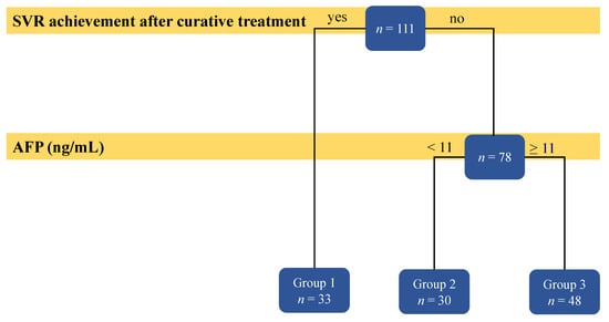 The results of the decision tree analysis are shown in Figure 3. Patients who achieved SVR after curative treatment (n = 33) had the longest recurrence-free survival. Furthermore, among the patients who did not achieve SVR (n = 78), those with AFP levels ≥ 11 ng/mL (n = 48) had poorer recurrence-free survival than those with AFP levels < 11 ng/mL (n = 30). Table 2 shows the baseline demographic breakdown divided into these three groups (see Figure 3 for grouping), and there were no significant differences in any variables except recurrence-free survival (RFS) (p < 0.001).