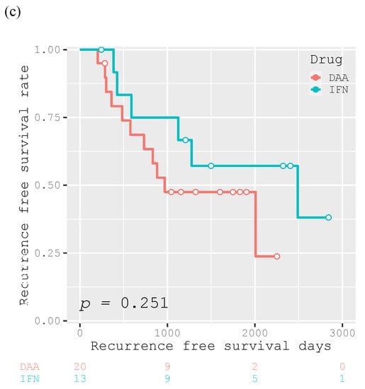 The 1-year, 3-year, and 5-year RFS rates of the participants were 84.0%, 42.0%, and 28.3%, respectively, and the median RFS was 882 days (Figure 4a). Patients who achieved SVR after curative treatment had a significantly longer recurrence-free survival than those who did not (p = 0.004; Figure 4b). However, there was no significant difference in the RFS between patients who achieved SVR with DAA and IFN therapy (p = 0.251; Figure 4c).