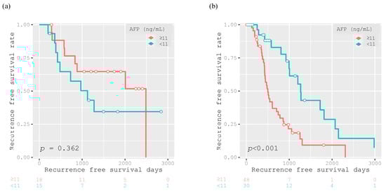 Among the patients who achieved SVR, there was no significant difference in the RFS rate between patients with AFP levels ≥ 11 ng/mL and <11 ng/mL (p = 0.362; Figure 5a). On the other hand, among the patients who did not achieve SVR, those with AFP levels ≥ 11 ng/mL had significantly poorer RFS than those with AFP levels < 11 ng/mL (p < 0.001; Figure 5b).