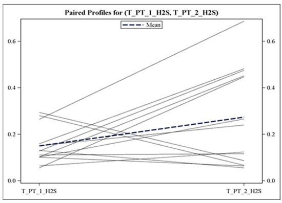 Individual trajectories of H2S concentration in patients with OSA. H2S levels (in μM) were analyzed at baseline (before sleep, T_PT_1) and at the time of OSA diagnosis (T_PT_2). Data from patients with baseline H2S of >0.5 μM (n = 4) were not included.