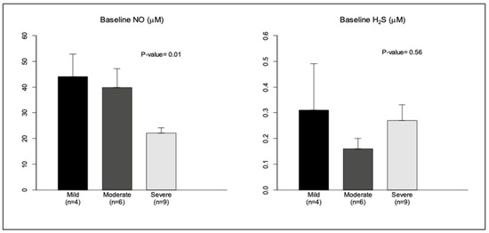 To further understand the interactions between these molecules, we compared baseline levels of NO, H2S, and HO-1 among patients with OSA in terms of OSA severity. The severity of OSA was classified based on the AHI into: mild OSA, if the AHI was >5 to <15 per hour, moderate OSA if the AHI was >15 to <30 per hour, and severe OSA (>30 per hour) [35]. Out of the 19 cases, there were 4 cases with mild OSA, 6 with moderate OSA, and 9 with severe OSA. NO levels were inversely proportional to the degree of severity of OSA, similarly to previous observations [36]. A similar analysis with baseline levels of H2S did not show a relationship with the degree of severity, probably due to higher variability in these values (Figure 2). Additionally, baseline HO-1 also showed no relationship with severity. However, correlation analysis of baseline NO and H2S levels revealed a moderate inverse relationship between these gasotransmitters (Spearman correlation coefficient r = −0.32; p = 0.11).