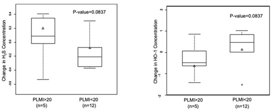 Subjects with PLMI > 20 showed higher NO and lower H2S levels compared to subjects with PLMI < 20. When we analyzed the changes in gasotransmitter levels between the two time points, we found that NO levels largely decreased in all OSA patients, irrespective of the PLMI (data not shown). However, OSA patients with a PLMI of >20 per hour showed an increase in H2S levels, and a decrease was observed in subjects with a PLMI of <20 per hour (0.20 ± 0.12 µM vs. −0.08 ± 0.08 µM; p = 0.08). On the other hand, we observed an inverse relationship between changes in H2S and HO-1 levels vs. PLM frequency (Figure 3). HO-1 levels decreased in subjects with a PLMI of >20 per hour and increased in those with a PLMI of <20 per hour (−0.64 ± 0.23 ng/mL vs. 0.14 ± 0.23 ng/mL; p = 0.08).
