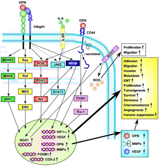 OPN plays pivotal roles in tumor development and progression. In lung adenocarcinoma, OPN is functionally involved in early stages of airway epithelial carcinogenesis driven by smoking and mutant KRASG12C [70]. Binding of OPN and its proteolytic fragments to cancer cells activates various signaling pathways, including JNK, Ras/Raf/MEK/ERK, PI3K/Akt, JAK/STAT, NF-κB, TIAM1/Rac1, and p38MAPK, leading to increased cancer cell adhesion, spreading, migration, invasion, metastasis, epithelial–mesenchymal transition (EMT), proliferation, tumor growth, survival, chemoresistance, stemness, angiogenesis, and immune suppression [8,54,71,72,73,74,75,76,77,78,79] (Figure 1). Recent studies have revealed novel mechanisms of OPN-mediated tumor progression. Upregulation of OPN expression by parathyroid hormone-related protein (PTHrP), which is frequently amplified as part of the KRAS amplification in patients with pancreatic cancer, promotes pancreatic ductal adenocarcinoma cell migration and metastasis [80]. The exosomal S100A4 that is derived from highly metastatic HCC cells activates OPN transcription via STAT3 phosphorylation and thereby promotes the metastatic potential in low metastatic HCC cells. Indeed, HCC patients with both high plasma exosomal S100A4 and plasma OPN levels have a poor prognosis [55]. Moreover, OPN promotes HCC cell proliferation and migration by increasing reactive oxygen species (ROS). This OPN-mediated ROS production is induced by stimulating JAK2/STAT3/NADPH oxidase 1 (NOX1) signaling [71]. OPN also promotes small-cell lung cancer and colorectal cancer cell proliferation by inhibiting autophagy and apoptosis [77,81]. Furthermore, YAP-dependent transcriptional induction of OPN stimulates c-Met expression in continuous endothelial cells. The c-Met expression sensitizes the continuous endothelial cells to the promigratory effects of liver sinusoidal endothelial cell-derived HGF, which contribute to the formation of a tumor-supporting microenvironment in liver tumorigenesis [53].