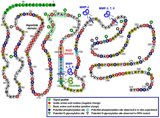 Primary structure and post-translational modifications of osteopontin. Potential phosphorylation and O-glycosylation sites, protease cleavage sites, integrin binding and aspartate domains, and signal peptide are highlighted. Integrin binding domains (E131LVTDFPTDLPAT143, R159GD161, and S162VVYGLR168) and aspartate domain (D86DMDDEDDDD95) are in boxes.