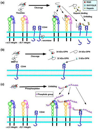 Post-translational modifications of osteopontin (OPN) and its interactions with receptors in cancer progression. (a) After cleavage of OPN by thrombin, N-terminal fragment may associate with αvβ3 and α9β1 integrins as well as CD44, while the C-terminal fragment bound to heparin may associate with CD44. (b) Cleavage of MMP-9 generates four OPN fragments, and a 5 kDa-OPN fragment may bind to CD44. (c) Phosphorylation of OPN may inhibit the internal interaction, probably between positive and negative charge residues, leading to unfolding, and then associate with integrins and/or CD44.