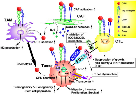 CAF-derived OPN participates in tumor progression [143,198]. In luminal breast cancer, α-smooth muscle actin-positive CAFs are associated with a poor prognosis and a more aggressive phenotype of tumor cell lines in patients with the cancer [43]. The α-smooth muscle actin-positive CAFs isolated from luminal breast tumors overexpress OPN and the OPN expression is associated with a higher percentage of Ki67-positive cells in tumor tissues. In in vitro culture models, the α-smooth muscle actin-positive CAFs enhance colony formation of luminal breast cancer cell lines, which is attenuated by OPN-neutralizing antibodies [43]. CAFs that are cultured with TAM-derived OPN significantly increase OPN expression, which is associated with enhanced proliferation, invasion, and migration of HCC cells [198]. In myofibroblasts, the signal adaptor MyD88, an essential component of TLR signaling, is activated in colitis-associated cancer [199]. MyD88 signaling in myofibroblasts increases the secretion of OPN, which promotes macrophage M2 polarization via activation of the STAT3/PPAR γ pathway. CAF-derived OPN may also contribute to tumor progression by increasing the stem cell population. In the stroma of human breast cancer, the increased expression of cyclin D1 is associated with poor outcomes [200]. Cyclin D1 can transform fibroblasts to CAFs that upregulate OPN expression, and then the OPN induces stem cell expansion. Indeed, the abundance of OPN is increased >30-fold in the stromal fibroblasts of patients with invasive breast cancer, associated with poor outcomes [200]. Similarly, CAF-secreted OPN promotes in vivo clonogenicity in colon cancer [201] and increases the cancer stem cell population via the OPN-CD44 axis in pancreatic carcinoma cells [110].