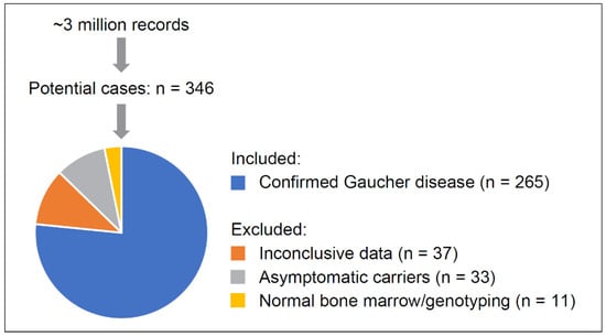 A total of 346 potential cases of Gaucher diseases were identified from the MHS database. Of these, 265 were confirmed as Gaucher disease, either with a documented receipt of ERT or SRT with the Israeli Ministry of Health or confirmed by chart review (Table 2). Of the 81 cases excluded from further analyses, 11 were evaluated for Gaucher disease but were excluded based on normal bone marrow and/or genotyping as determined by the physicians seeing the patients in the clinic, 33 were determined to be asymptomatic carriers, and 37 were excluded owing to inconclusive data, i.e., lack of documented receipt of ERT or SRT and lack of free-text physician notes indicating Gaucher disease (Figure 1).