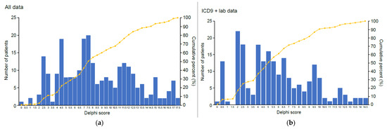 Frequency and cumulative frequency of the GED-C scores of all data sources, and ICD-9 coding plus laboratory data. (a) All data; (b) ICD9 + lab data. GED-C = Gaucher Earlier Diagnosis Consensus; ICD-9 = International Classification of Diseases, Ninth Revision.