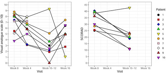 Median objective SCORAD decreased from 37.1 (28.9–38.4) to 19.8 (17.0–22.4) (p = 0.016). Median delta objective SCORAD was −13.8 ((−19.4)–(−6.2)).