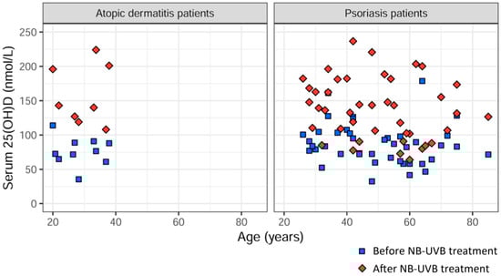 The increase of 25(OH)D was significantly higher in this subset of AD patients (mean change 79.8 nmol/L) compared to NB-UVB treated psoriasis patients (mean change 50.7 nmol/L) described earlier []. A previous study on the effects of NB-UVB on 25(OH)D levels in patients with AD, psoriasis, and healthy individuals has shown similar results where AD patients had a higher increase of 25(OH)D compared to psoriasis patients (68.2 nmol/L versus 59.9 nmol/L). NB-UVB-treated healthy subjects had the highest increase of 25(OH)D (90.7 nmol/L), but the difference was not statistically significant between the three groups (p = 0.21) []. The differences could not be explained by age or pre-treatment levels of 25(OH)D in the previous study.