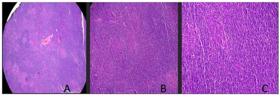 Parotid gland slices shown at various magnifications. (A) Low-power magnification demonstrates a diffuse lymphoid infiltrate with effacement of nodal architecture including lack of follicles and germinal center formation. From this parotid gland sample, clear demarcation of lymphoma from salivary gland tissue is not distinguished in the biopsy specimen. (B) Mid-power examination demonstrates a dense lymphoid infiltrate with a proliferation of monotonous-appearing lymphocytes. (C) High-power examination demonstrates a proliferation of small lymphocytes with overall mature-appearing chromatin and scant cytoplasm. No large atypical cells or areas of necrosis are identified.
