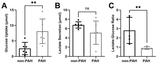 PAH HPAECs consumed more glucose and produced less lactate compared to non-PAH HPAECs. (A) Glucose uptake and (B) lactate secretion in non-PAH (black circles) and PAH HPAECs (gray triangles) measured via YSI Bioanalyzer. n = 6 human donors per condition. (C) Lactate/glucose ratio for non-PAH and PAH HPAECs. n = 5 human donors per condition, with one outlier for each condition omitted. ns: not significant; ** p < 0.001.