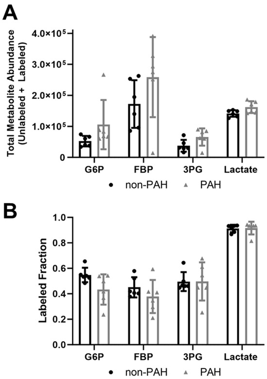 Total glycolytic metabolite abundances were higher in PAH HPAECs than non-PAH HPAECs but the labeled fraction did not change. (A) Total metabolite abundances (labeled and unlabeled) and (B) labeled fraction (labeled/total) for glucose-6-phosphate (G6P), fructose-1-6-bisphosphate (FBP), 3-phosphoglycerate (3PG), and lactate measured by 13C6 glucose mass spectrometry in non-PAH and PAH HPAECs. n = 6 human donors per condition.