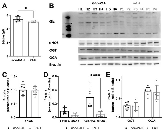 Since patients with PAH have reduced nitric oxide levels [6,7,16], we measured endothelial nitric oxide production in non-PAH and PAH HPAECs. Nitrite decreased by about 7.5% in PAH HPAECs (p < 0.01) as compared to non-PAH HPAECs (Figure 3A). However, PAH HPAECs showed ~65% lower total O-GlcNAcylated proteins and more than 80% lower eNOS O-GlcNAcylation (p < 0.0001; Figure 3B,C). This occurred without a change in OGT or OGA protein (Figure 3D).