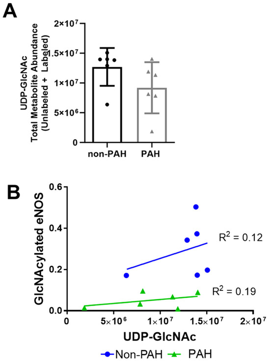 UDP-GlcNAc total metabolite abundances were lower in PAH HPAECs compared to non-PAH HPAECs. (A) UDP-GlcNAc total abundance measured by mass spectrometry in non-PAH and PAH HPAECs. n = 6 human donors per condition. (B) Correlation analysis of GlcNAcylated eNOS versus UDP-GlcNAc levels for non-PAH and PAH HPAECs.