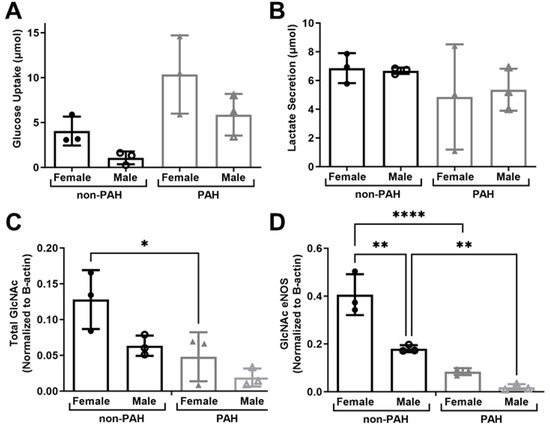 Since we observed high donor variability in this study, we separated the data by donor sex to determine how sex may affect endothelial glycolytic metabolism and protein O-GlcNAcylation. HPAECs from female donors had higher glucose uptake (Figure 5A). In contrast, lactate secretion was similar between sexes (Figure 5B). Both total protein and eNOS O-GlcNAcylation were higher in female as compared to male donors (Figure 5C,D). Total GlcNAcylated protein was statistically significantly higher in non-PAH female as compared to PAH female donors (p < 0.01). GlcNAcylated eNOS was statistically significantly higher for both non-PAH female (p < 0.00001) and male (p < 0.001) donors as compared to HPAEC donors. Thus, there are likely important sex differences in glucose metabolism and eNOS O-GlcNacylation, which may contribute to sexual dimorphisms in PAH.
