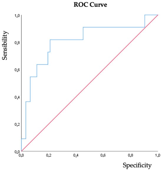 The variables that presented statistically significant results, p < 0.05, were included in a binary logistic regression, with the aim of creating a predictive model of surgical difficulty. Multicollinearity was assessed using a correlation matrix []. Using this model, the predicted probabilities were calculated and used to construct a Receiver Operating Characteristic (ROC) curve to determine the cutoff with maximum sensitivity, in order to equal the specificity value obtained in the literature. An Area Under the Curve (AUC) value close to 1 was considered a high probability of correct identification of individuals, while values of 0.5 were assumed to have no discriminatory capacity [].