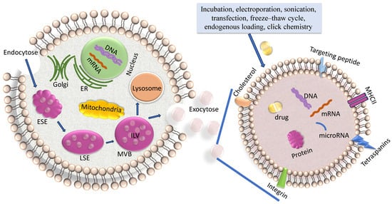 Biogenesis of exosomes. On the left side, the biogenesis of exosomes, and on the right side, an enhancement of an exosome loaded with a drug are shown. The biogenesis of exosomes is described in the text and comprises endocytosis, MVB formation and exosome secretion into the extracellular microenvironment. Lading of exosomes, as described in the text, is carried out by diverse methods. ER, endoplasmatic reticulum; ESE, early sorting endosome; LSE, late sorting endosome; MVB, multivesicular body; ILV, intraluminal vesicles.